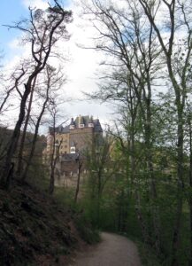 Oberstraße in Moselkern.Trail to Burg Eltz.Approaching Burg Eltz from the trail.View of the southeastern side of Burg Eltz; the castle dates back to the 12th-century AD, but of course many additions have been made since then; additionally, extensive restoration work was completed in the 1800s.View of Burg Eltz near the entrance gate.Approach and gate to Burg Eltz.Looking up from the inner bailey in Burg Eltz; the castle is still privately owned by the Kempenich, Rübenach, and Rodendorf families.Cupping head in an elector’s case.Interesting sculpture with four different faces (one on each side) and eyes shared between them.Three types of maces, a war-hammer, and an equestrian war-hammer (for Cuirassiers) with a wheel-lock pistol (from the 15th- and 16th-century AD).Drinking bowl in the shape of a ship (from 1685 AD).Another view of the inner bailey in Burg Eltz.Rain gutter spout in the shape of a dragon.Bridge and gate to the old city of Mayen.Schloss Bürresheim – a medieval castle that dates back to the 12th-century AD and has been expanded and remodeled since; it is now a mixture of Romanesque and Baroque architectural styles.Baroque ornamental garden, which was formerly a kitchen garden for Schloss Bürresheim.Looking up at the south round tower, which was built from the 13th- to 15th-century AD.Barbican in Schloss Bürresheim, which is the only access to the inner castle from the outer ward.Inside the covered gateway (known as “cannon alley”) for Schloss Bürresheim.Kitchen inside the castle.Inner bailey of Schloss Bürresheim.Looking out from the covered gateway toward the barbican.One last view of Schloss Bürresheim.Trail back to Mayen, from Schloss Bürresheim.Revisiting Burg Eltz.View of Burg Eltz from near the ruins of Burg Trutzeltz, which was a small siege castle built on a rocky outcrop to the north during the Eltz Feud (1331-1336/37 AD) – the siege lasted two years and trebuchets, as well as a pot-de-fer (a primitive cannon), were used against Burg Eltz.Woods along the trail to Old Sayn Castle.Römerturm am Pulverberg – a reconstruction of a Roman watchtower, which marks the Limes Germanicus (i.e. the frontier of the Roman Empire in Germany).Old Sayn Castle.Schloss Sayn – the New Sayn Castle.Painting of the new and old Sayn Castles, with the Schloßpark in the foreground.Portrait of Princess Leonilla zu Sayn-Wittgenstein-Sayn (1816-1918 AD), after an oil painting by Franz X. Winterhalter – displayed in Schloss Sayn.Chapel inside Schloss Sayn.Butterfly in the Garten der Schmetterlinge (“Butterfly Garden”) in Schloßpark Sayn.A butterfly with partially transparent wings.Chameleon inside the butterfly garden.Pond in the Schloßpark Sayn.Woods near Monrepos in Neuwied.